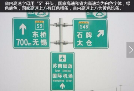 省內(nèi)高速字母用“S”開頭,如S9高速等,國家高速和省內(nèi)高速均為白色字體,綠色底色,國家高速上方有紅色橫條,省內(nèi)高速上方為黃色飾條。需要注意的是,字母“G”和“S”開頭的高速均為全封閉高速公路,只是“S”開頭的標(biāo)識(shí)代表該路段屬于某某省境內(nèi),并無其它含義。
